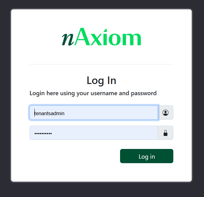 - Wpisz w przeglądarce adres https://<naxiom-domain>/tenatnsadmin. Zostanie wyświetlona strona logowania do serwisu tenant-admin: