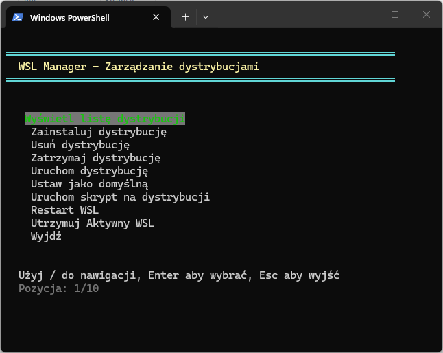 Skrypt zawiera polecenia umożliwiające zarządzanie dystrybucjami, zarządzanie podsystemem WSL oraz uruchamianie skryptów w domyślnej dystrybucji systemu Linux.