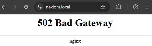 oc apply -f ./routes/naxiom-local.yaml -n <naxiom-project> oc apply -f ./routes/wildcard-naxiom-local.yaml -n <naxiom-project> oc apply -f ./routes/rabbitmq-naxiom-local.yaml -n <naxiom-project> - Sprawdź, czy domena ustawiona w konfiguracji obiektu route jest dostępna w przeglądarce. Błąd 502 jak na ilustracji poniżej oznacza, że serwis Nginx działa. Wystąpienie innego błędu będzie oznaczało, że ruch nie dociera do serwisu Nginx.