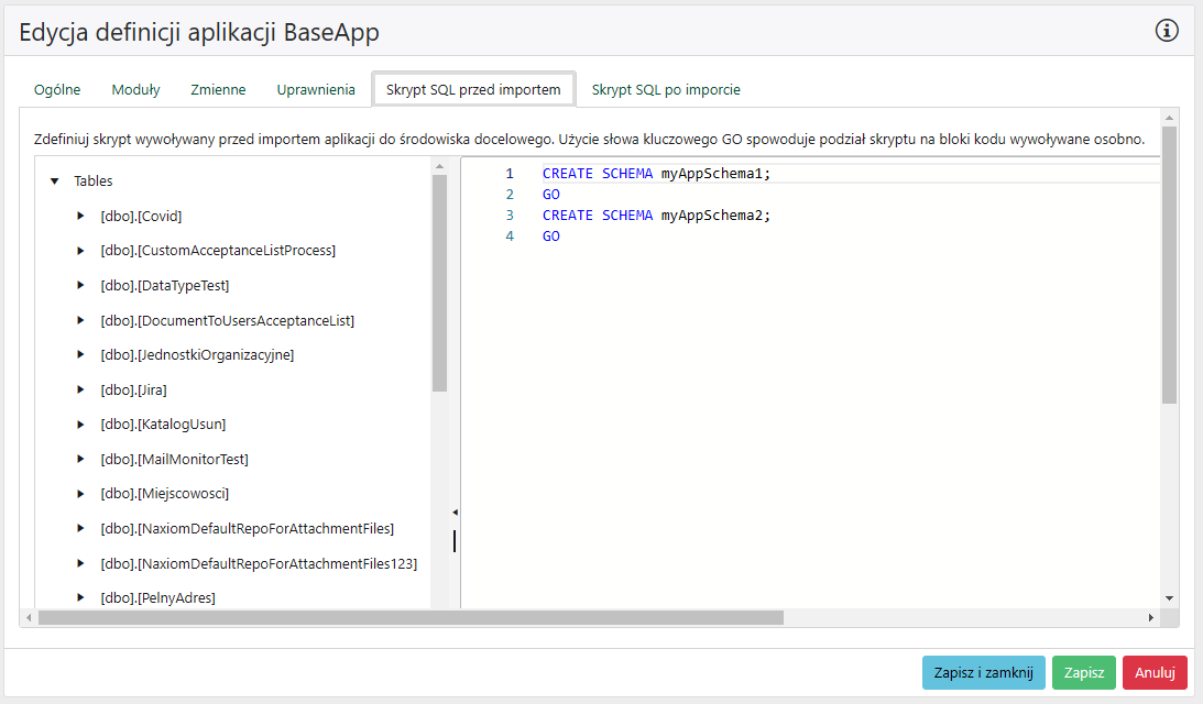 ADMINISTRACJA > Lista aplikacji > Dodaj definicję/Edytuj > Skrypt SQL przed importem/po imporcie