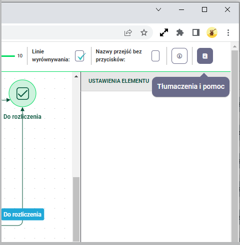 Na diagramie procesu przycisk Tłumaczenia i pomoc jest reprezentowany przez ostatnią ikonę z prawej strony na pasku narzędzi u góry.