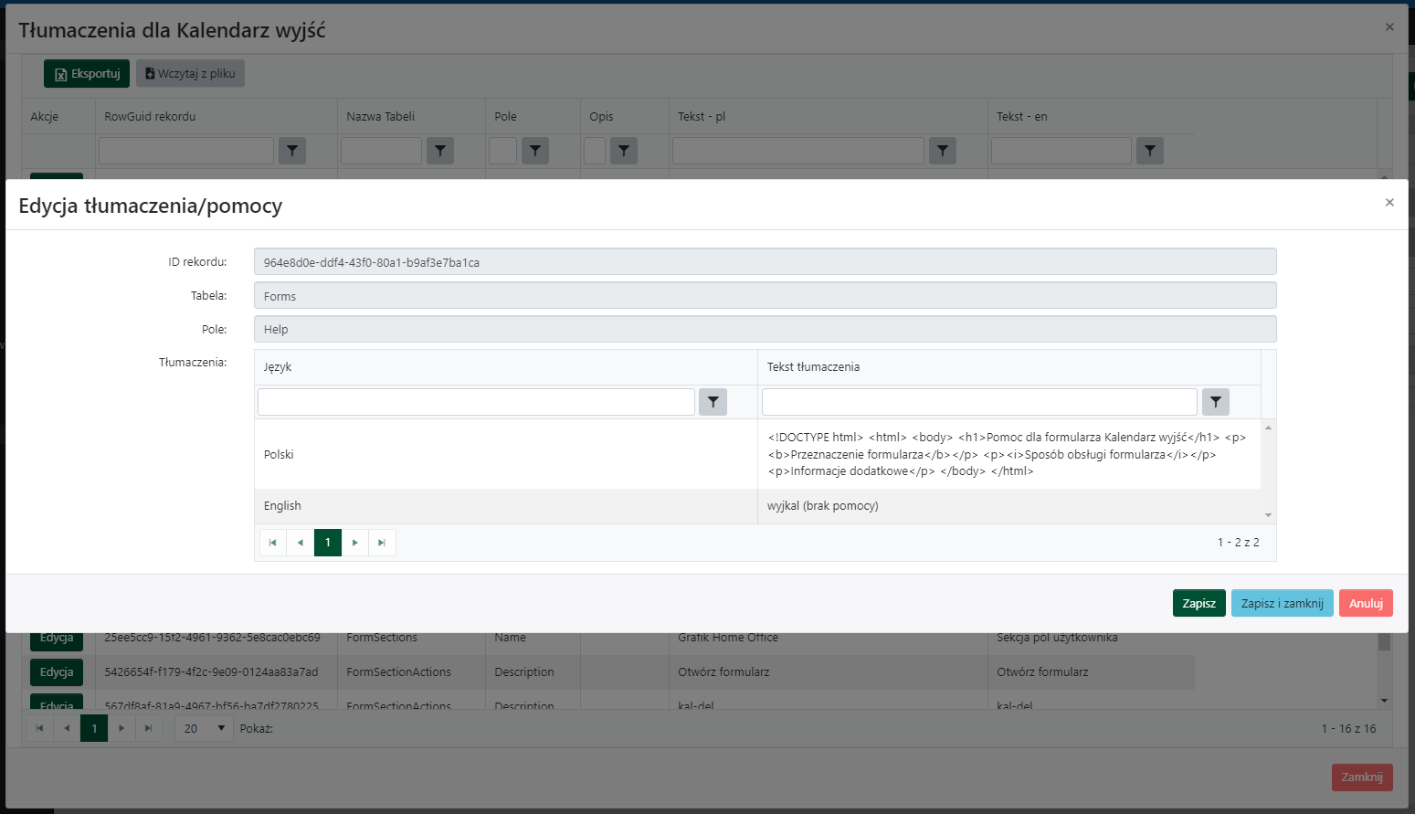 2. Kliknij przycisk Tłumaczenia i pomoc. Zostanie wyświetlona tabela z tekstami tłumaczeń i pomocy.