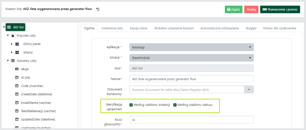 INTERFEJS UŻYTKOWNIKA>Listy>Edytuj>Ogólne>Weryfikacja uprawnień>Według szablonu instancji/Według szablonu statusu